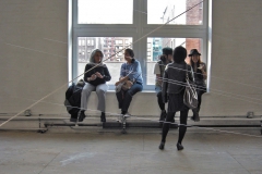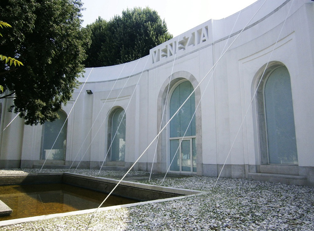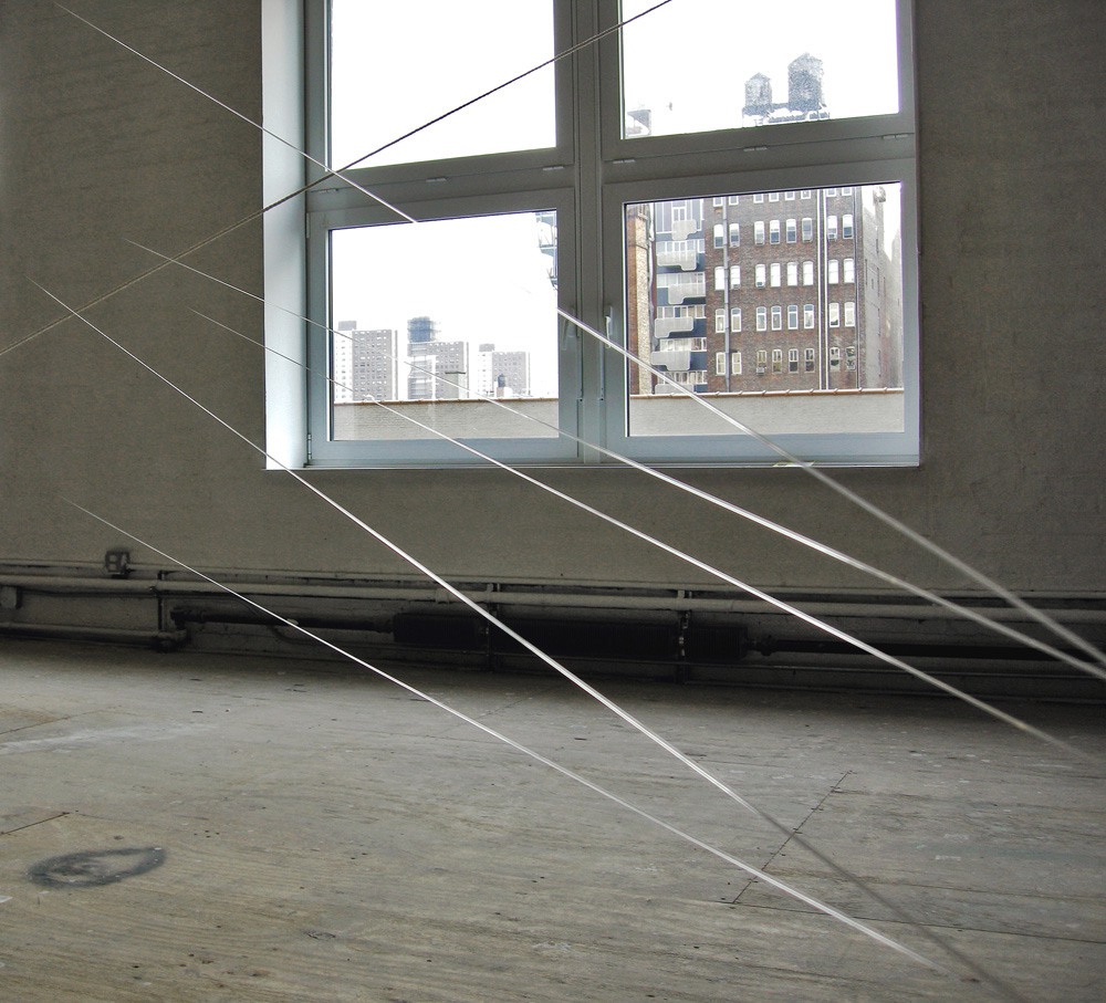It shows lines tensed from a wall to another wall, directly from the wall the lines go out, directly into the wall go in, individuating a piece of something to show, what in the moment is important to let to see. In all cases is a piece of story dedicated to a space.