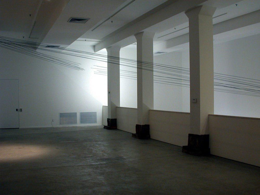It shows lines tensed from a wall to another wall, directly from the wall the lines go out, directly into the wall go in, individuating a piece of something to show, what in the moment is important to let to see. In all cases is a piece of story dedicated to a space.